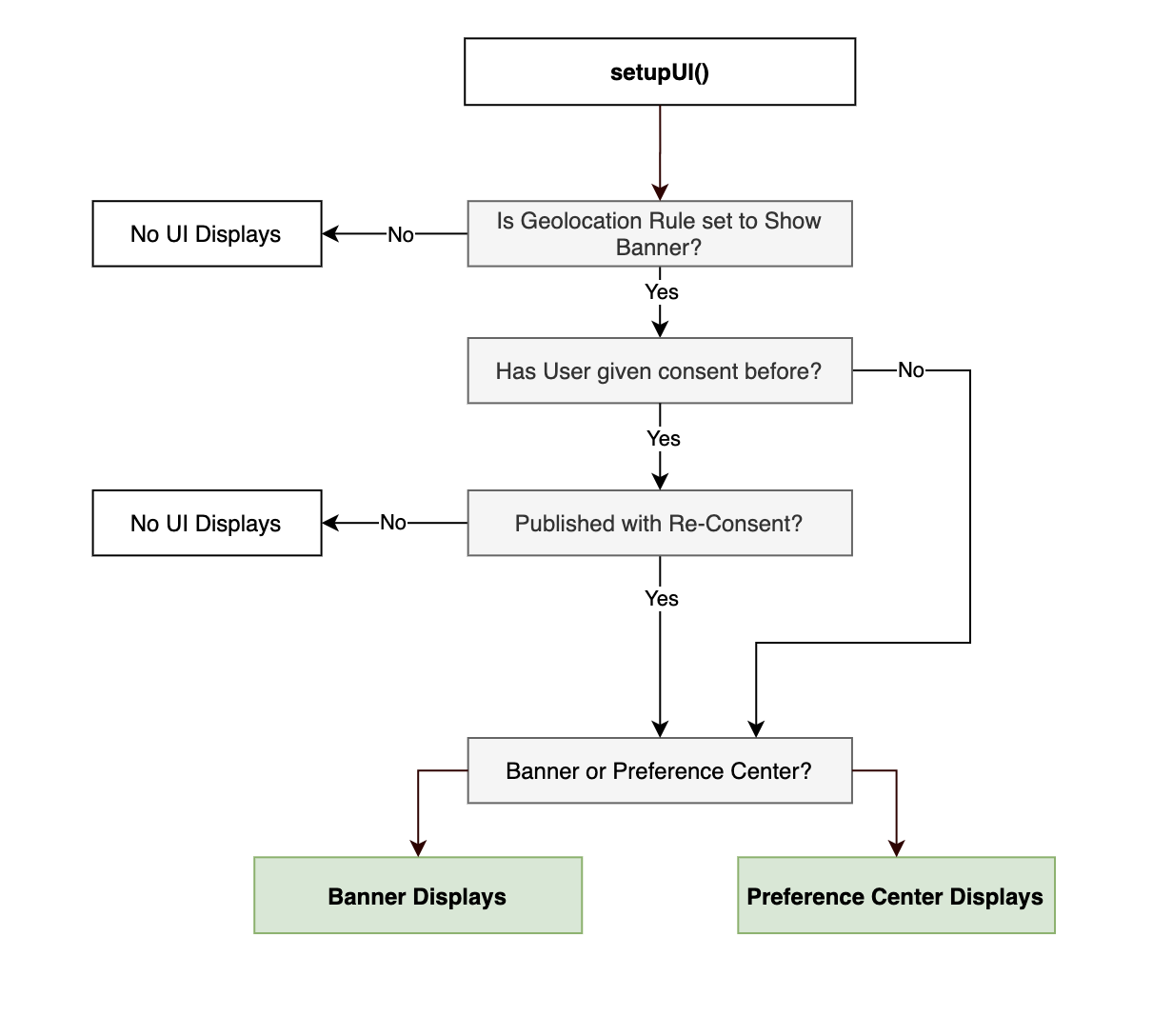 If you'd like to explicitly call the banner or preference center UI without the automation of setupUI(), do not specify a UIType with setupUI(). View the Recommended Approaches Based on Regulatory Use Case section for more information.